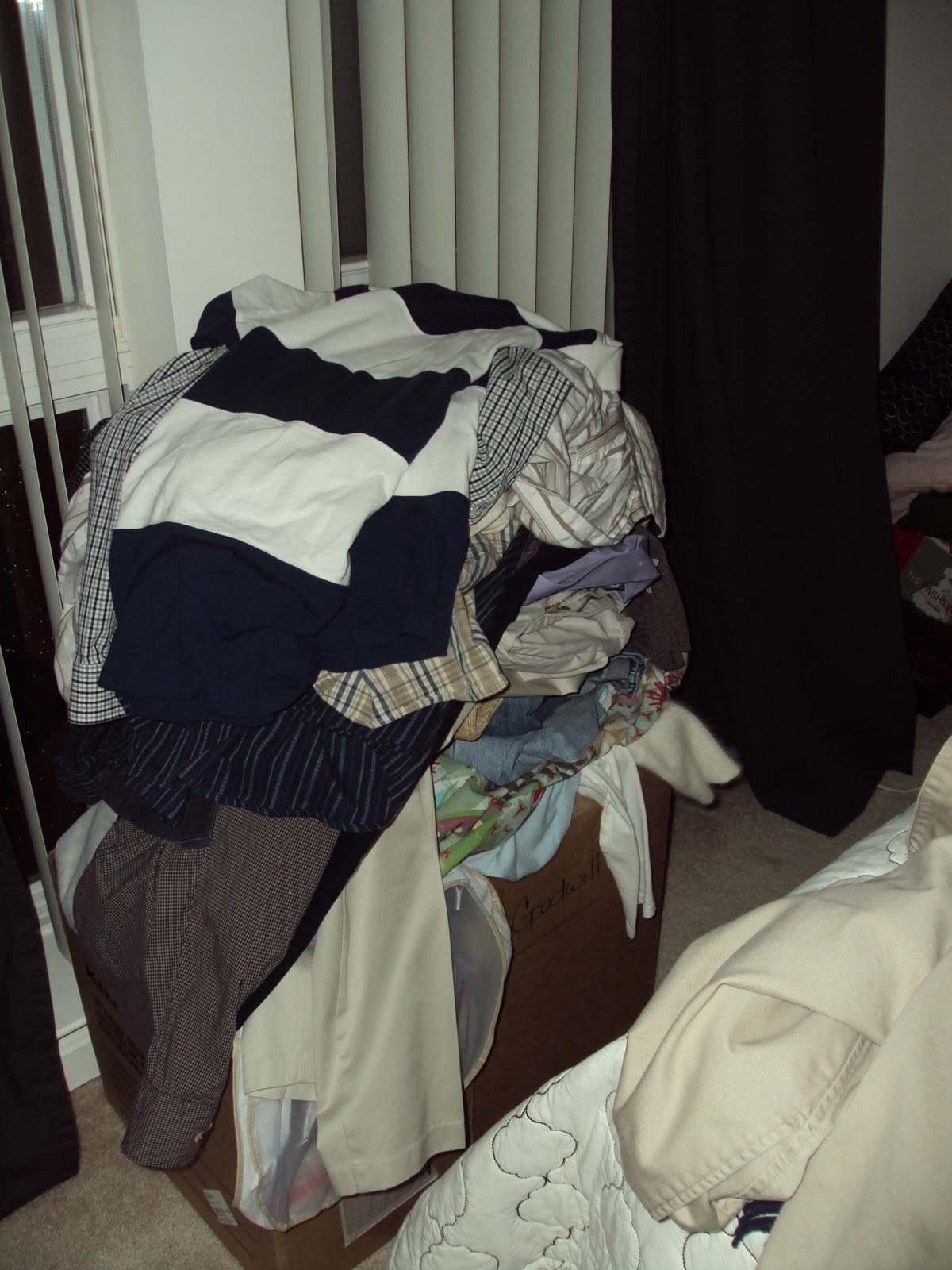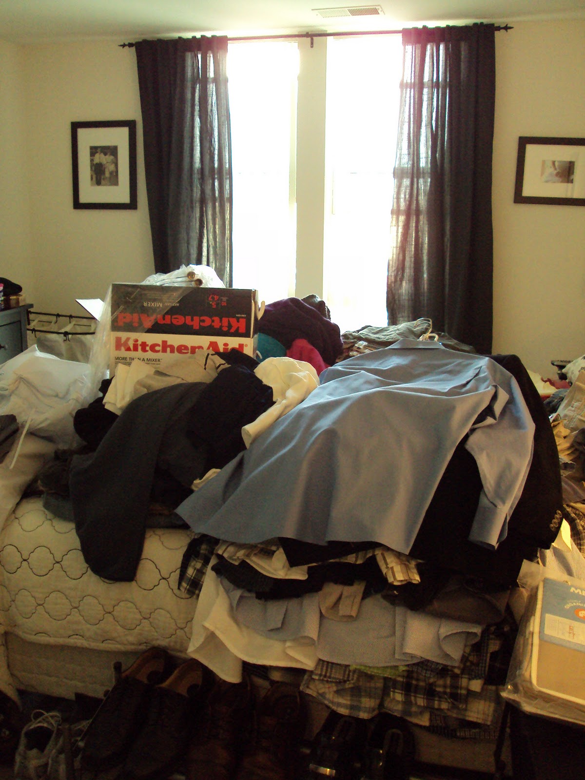 Don’t worry, it’ll look pretty again soon, I swear. Also, a word of caution: Don’t sort through stuff as you’re taking it out of the closet. You’ll get too mired in the “Oh that’s pretty…” or “I remember that wedding I wore that in 10 years ago…” moments and nothing will get done and you’ll be sleeping on your clothes rather than your pretty bed. I did, however, put my clothes on my side of the bed and his clothes on his side. I figured it might make it easier while going through them.