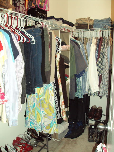 I’m still trying to decide whether I like the sweater rack at the front of the closet or in between mine and hubby’s clothes. I’d be interested in hearing your opinions.
