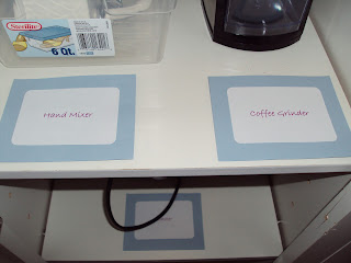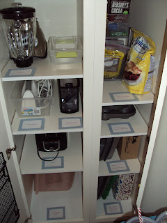 I purged quite a bit and then started replacing the items we planned to keep. Here are the labels stuck t the shelves with the goo:
