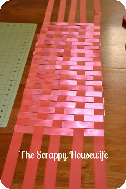 Then, I cut some 9″ strips of ribbon to weave between the long lengths of ribbon. I just used scrap-booking tape runner to tack down the ribbon. I’m not going to lie to you here, this is not something that my grandchildren will receive in some heirloom box. I didn’t make it to last, I made it to be pretty for a season or two and then re-purpose the ribbon. I’m totally OK with that.